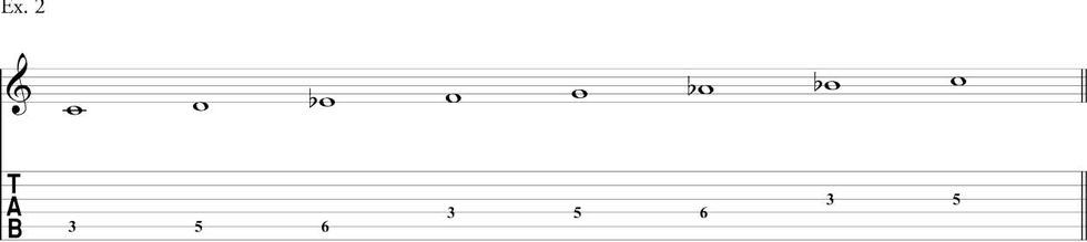 Even though it lies outside the formal major scale, the b2 has a similar gravitational pull, as heard in Ex. 7. You can feel how the Db note pulls us toward the root. As before, it feels frustrating when you delay the final note.