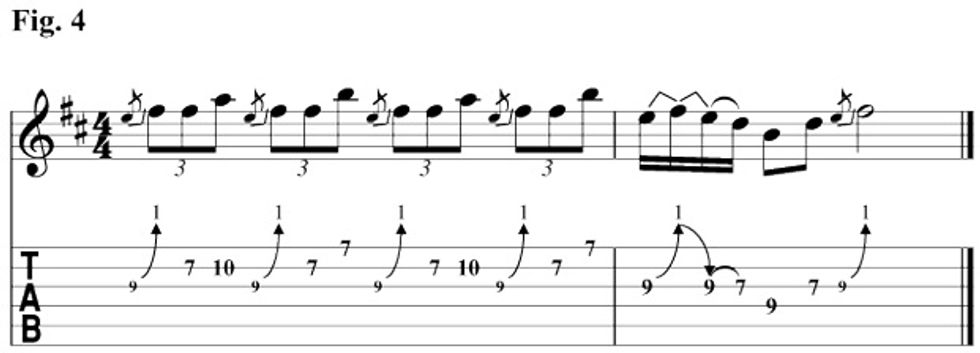 Next a whole-step bend, followed by a bend-and-release, illustrating an effective use of multiple bending techniques in a single phrase. Download Example Audio...