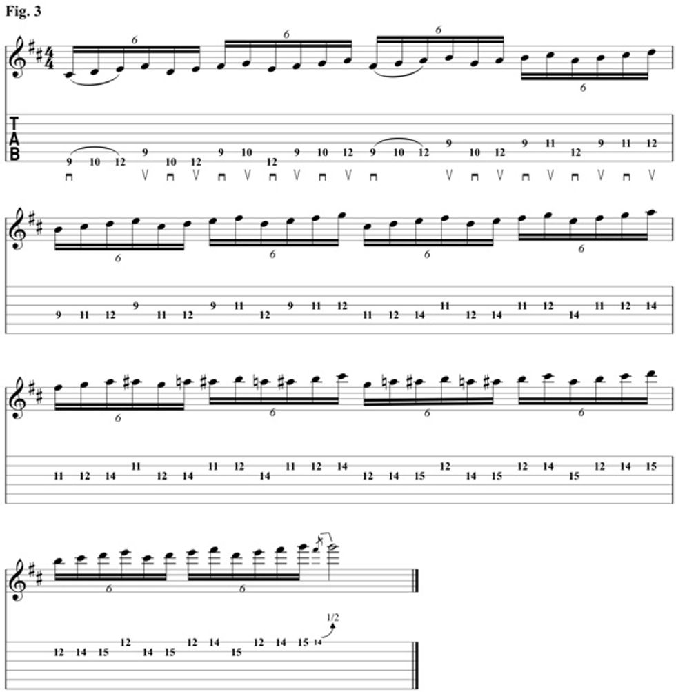 Now that you can play this first phrase, let’s take another look at what it actually is. I like to think of it as a nice self-contained set—three groups of four on two strings. That’s it. Now we’re ready to build it into something bigger in Fig. 2.
