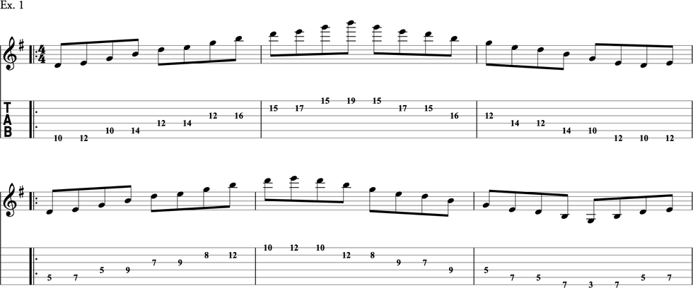 In Ex. 1 we’ll be playing the Em7 arpeggio (E–G–B–D) in two positions. Don’t worry, we won’t get into too much theory, just remember these shapes can be transposed into any key. The top one starts in 10th position and shifts up the neck, while the bottom one starts in 5th position. Getting these under your fingers will help map out quite a bit of the fretboard. I try to only visualize one octave at a time, and then take that shape and move it wherever I need to chase the melodic and rhythmic ideas that inspire me.