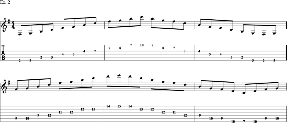 Ex. 2 follows the same idea, but this time using a Gmaj7 arpeggio (G–B–D–F#). I’ve chosen E minor and G major because they are closely related key centers. When learning these arpeggios, focus on the string pairs that occur in each octave. In the extended arpeggio that ascends from the 2nd fret, notice how the patterns recur in each octave. That’s not always the case, as you’ll see in the second arpeggio that ascends from the 9th fret.