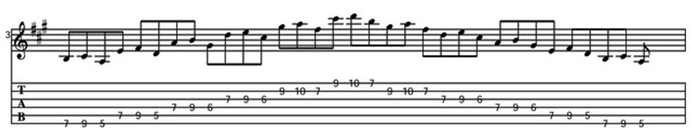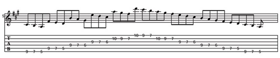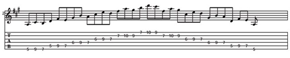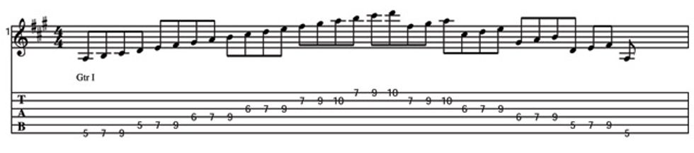 Let’s take a look at each example. A quick note: I’m just going to use an A Major scale, which consists of the notes A, B, C#, D, E, F#, G#, A