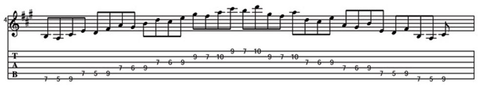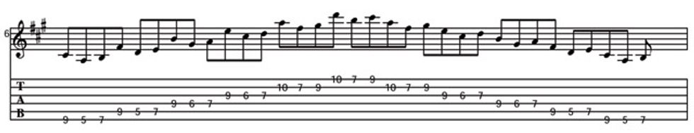 Now for the technique: feel free to explore legato, alternate picking, economy picking and string skipping. Also, be sure to try applying these to a more liner approach and be creative; the three-note-per-string variables will give you a more intervallic sound. Play them slow and scoop into some of the notes using your whammy bar like Holdsworth or Malmsteen. These will also help you to come up with more original sounding ideas, because it’s breaking you out of the normal ascending and descending traps. As a bonus, you will develop stronger finger independence because of the initial shock your fingers will encounter. So explore the possibilities and have fun.