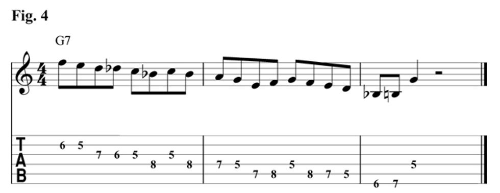 In Fig. 4, we start on the b7 and end on the root below it. Again, this lick is built for speed. The chromaticism leads from the 5 to b5 to 4, and then to the b3. This is very prevalent in blues licks. When the lick gets down to the low register, it slips back into a country sound with the b3-to-3 move. First play through it as written, then take it to the stratosphere.
