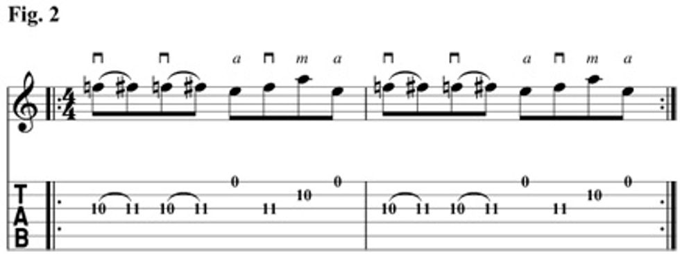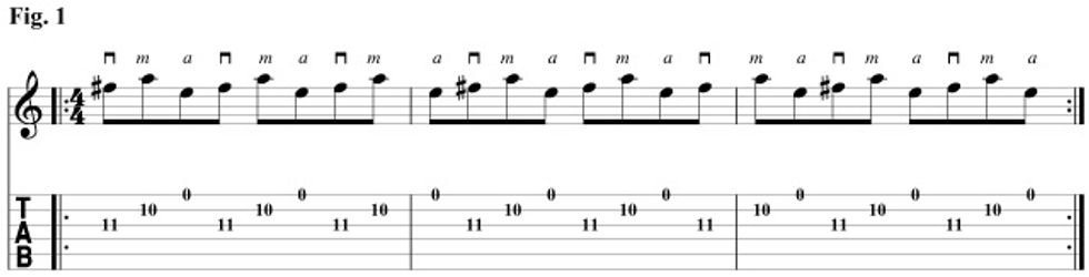 Fig. 1 is the forward roll using the interval of a third and an open string. Unfortunately, this stuff is key sensitive. You have to make sure the open string fits into the key you're playing in. In this example, we are playing in the key of D major. So, the open E will sound fine. Assuming you’re using a flat pick, the first note of the roll is played with the pick followed by the middle and ring finger. Make sure the middle and ring fingers have an equally strong attack. Keep your fingers close together and don't let them flail about.