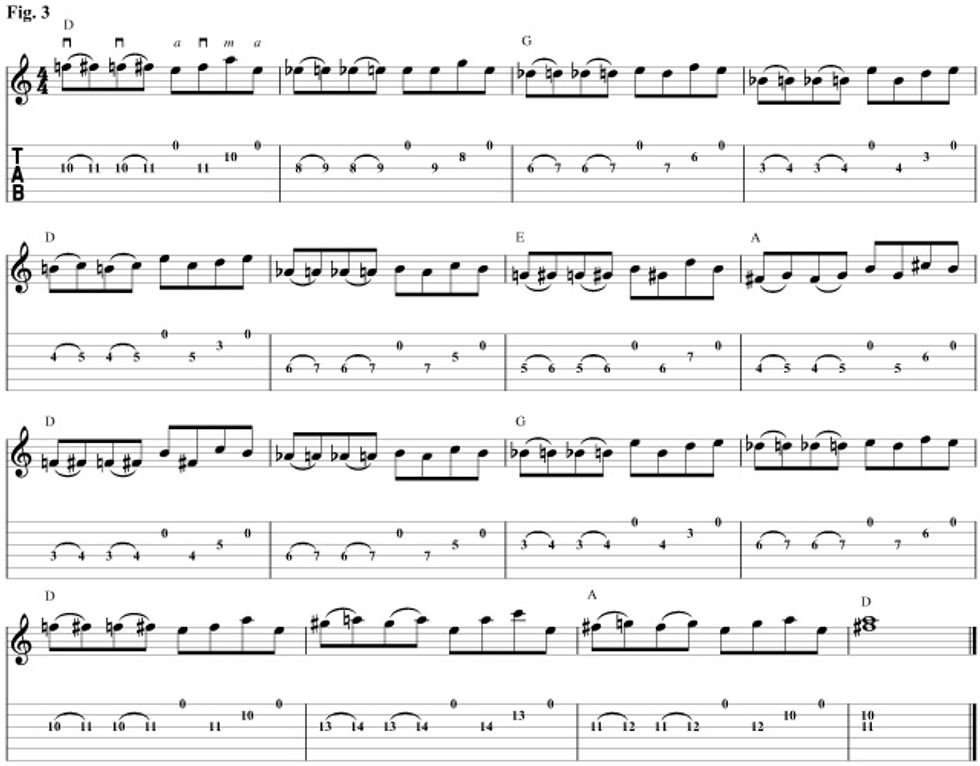 Fig. 3 is an etude over a common progression. I'll keep the same forward roll pattern in my picking hand for the whole exercise. Download example audio...