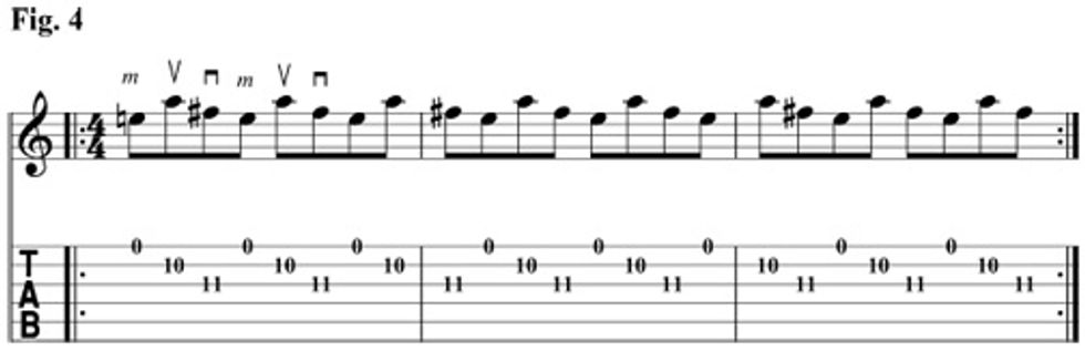 Fig. 4 Is the backwards roll. I’m going to use the same interval and the same key as the previous example. I'm going to start by plucking the open 1st string with my middle finger. Then I'll use an upstroke on the 2nd string and a downstroke on the 3rd string. This is the only way to make the backwards roll sound strong and even. It's a little tougher than the forward roll but with a little repetition you'll find yourself using it all the time. Download example audio...