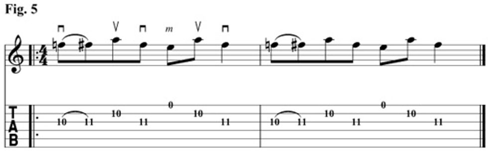 Fig. 5 is adding an approach note to the third with a hammer-on. Then I play an upstroke on the 2nd string followed by a downstroke on the 3rd string. I end with the backwards roll. Download example audio...