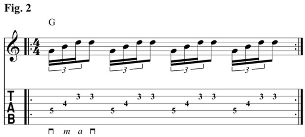 Let’s start with the technique. In Fig. 1 I’m going to start with a root position G major triad (G–B–D) based of the 4th string. We'll do a forward roll through the triad. A forward roll is a way of playing a series of notes across a string set with hybrid picking. I start by picking the fourth string followed by the middle finger plucking the third string and then the ring finger plucks the second string. If you haven't done this before then take some time to repeat it and build up some strength and speed. As it gets faster you'll start to notice the rolling effect. Start the lick off by doing this forward roll as a sixteenth-note triplet. The last thing to do is add a single note on the upbeat. After the triplet I'm picking the middle note of my triad on the third string. Put this together and you'll get the galloping effect. You could also try rolling forward and picking the high note of the triad on the second string. You can hear this in Fig. 2.