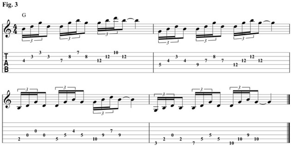 We move the triads around in Fig. 3. I'm going to break up the guitar into three string sets (3–2–1, 4–3–2, 5–4–3, 6–5–4) and move through the different inversions of a G major triad. In each measure we will start with the lowest inversion and move up the neck. You might find it helpful to first play the triad shapes up and down the neck and then add the gallop picking in the right hand only when you're comfortable.