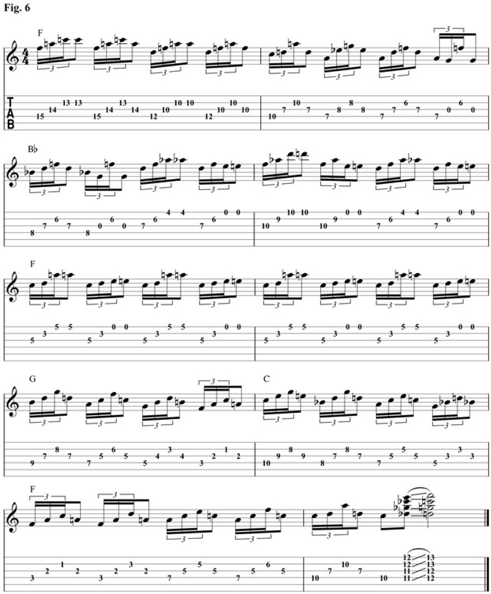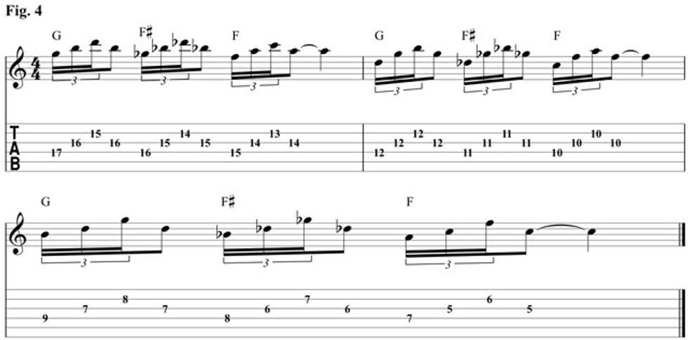 In Fig. 4 we're moving each triad shape down chromatically a whole step. This will turn it into the shape of an F major triad. When you walk each triad down you will end up with some combination of F–A–C. If you're still playing over a G chord these notes will now be sounding as the b7th, 9th and 11th, which could give you a G9sus sound. Try doing this exercise on each set of three strings and in at least three other keys.