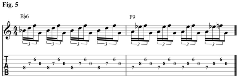 Open up and say extensions! In Fig. 5 we're adding an extension to each triad in the laziest way. What's simpler than just lifting a finger? I'm using a Bb major triad based on the 4th string. I start with all fingers down and do my forward roll. Then lift your middle finger off of the third string and play the open 3rd string on the upbeat. Make sure your first and third fingers are still down. You want all of these notes to ring into each other. The open G is acting as a 6th within the Bb. Now lets switch the shape to an F7. Do a forward roll through the triad and play the open 3rd string again on the upbeat, which allows the 9th (G) to ring.