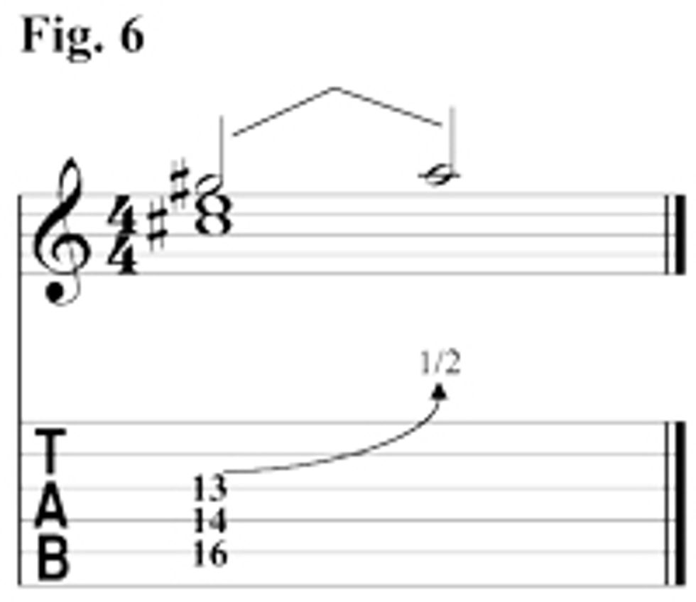 In Fig. 5 we combine the root position triad with a pre-bend. This time we start with the diatonic note above the 5th (F#) and resolve to the E on the 3rd string.