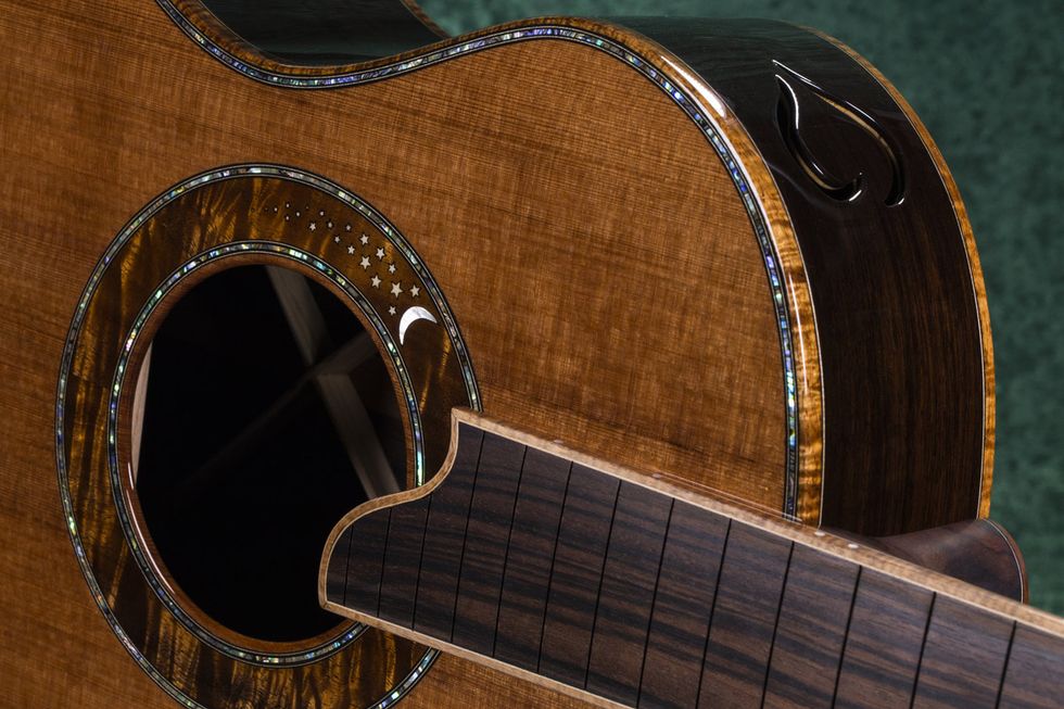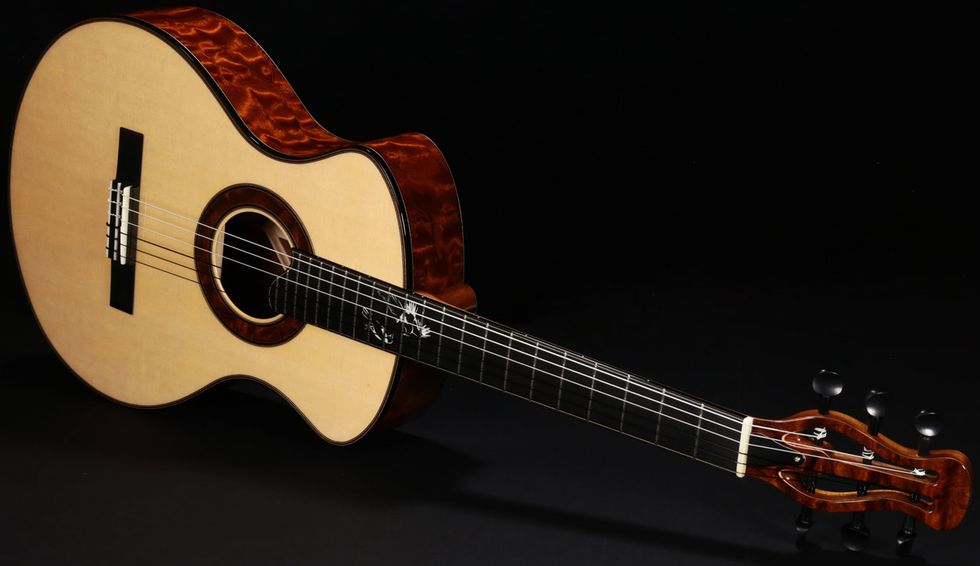 That artistic aesthetic informs his guitars’ looks as well. “I spend a lot of time trying to tell a story with the guitar,” he says. “A recent guitar I made was for a fellow in Seattle. He has two preschool daughters and he wanted a guitar to sing lullabies to them. We made a lullaby guitar and the whole thing was built around that. I used my pillow headstock and it was my snuggest parlor guitar that he could sit with. I did moon and stars on the rosette and a little heart-shaped soundport. The whole thing was built around putting these kids to bed. When it was done, they sent me a picture of the whole family to show me how happy they were with their new guitar. To me, that’s great, that’s as good as it gets.”