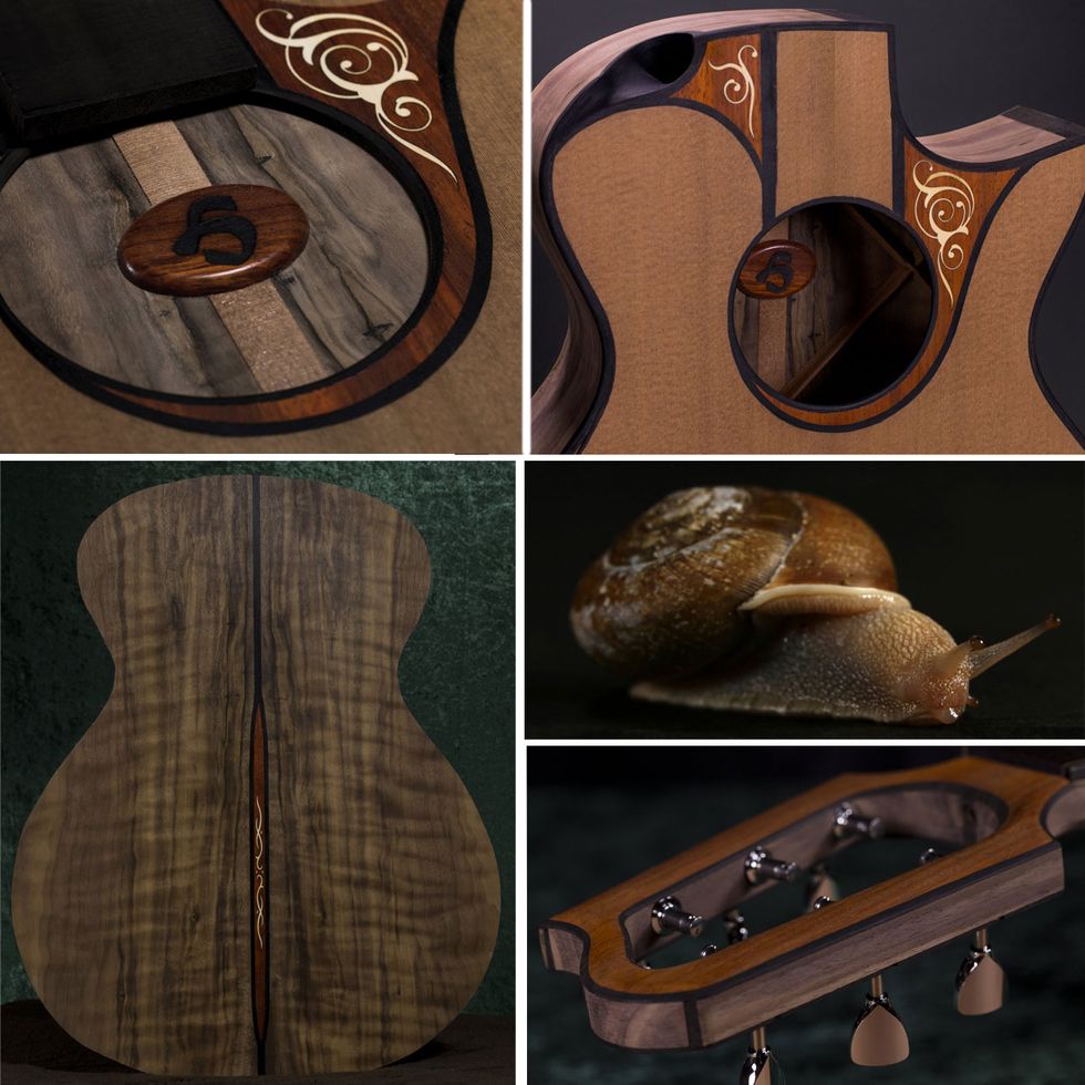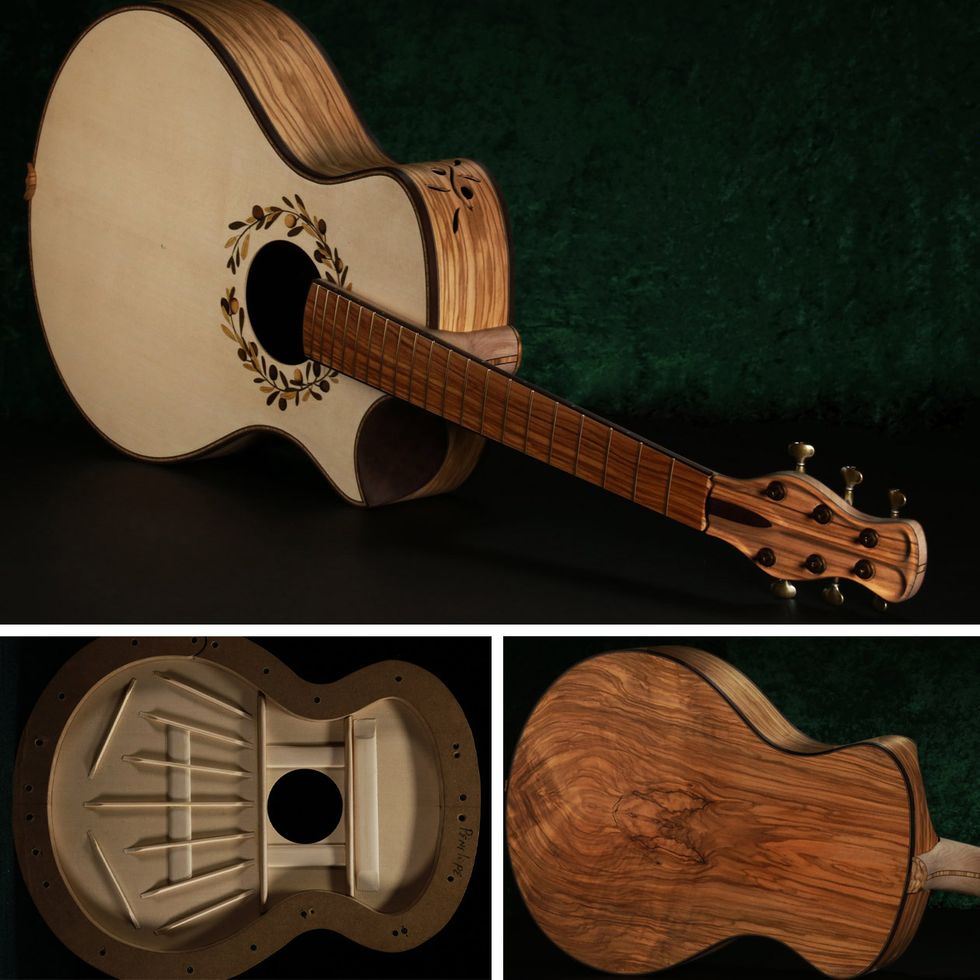 This guitar, Penelope, is an Italian olivewood guitar from Mark Hatcher’s Unlimited Series. “Its design is inspired by Venetian architectural decoration,” he says.
