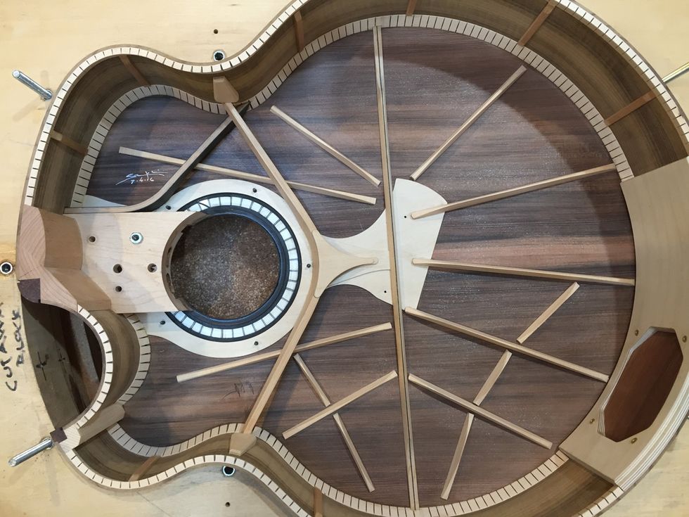 Claxton also doesn’t spend much time tuning tops. “When I bought wood—which I don’t buy anymore because I’ve got so much of it—the quality of wood that I bought over the years was so consistent in the characteristics, the weight and thickness, that I almost don’t have to do a lot between guitar and guitar. If you keep the quality of the tonewood in this little envelope—and if you build guitars like you always do—it’s almost guaranteed that you’re going to have a really nice-sounding guitar. I don’t use floppy tops. If you do, you have to do some serious modifications to the thicknessing, sometimes the bracing, but if all your woods have a similar high quality, then it’s guaranteed you’ll get a nice guitar.”