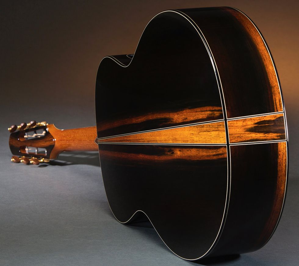 However, for fretboards, Kauffman still thinks ebony reigns supreme. “Ebony is far and away the best material there is,” he says. “Fully black ebony is becoming scarce and more expensive, but I also appreciate the character of the lighter streaks that come in the so-called ‘lesser quality’ ebony that we’re seeing today. I think people will accept it in the marketplace in time, and if they don’t like it, we can just dye it jet black. Easy enough to do.”