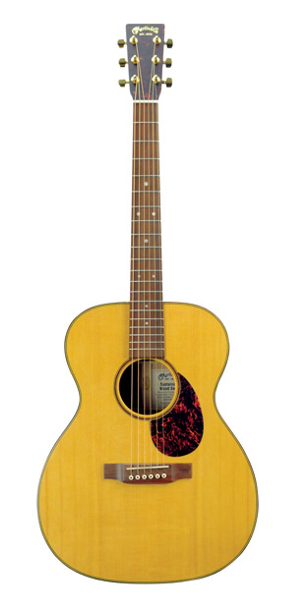 The guitar we got to review is an OM, which is a size and shape I love. The neck and back are made of sustainably grown cherry wood, while the fretboard and bridge are made from a recently discovered wood from Central America called katalox. Ranging from brown to dark purple, it’s very dense, and takes a high polish extremely well. Katalox is not hugely abundant, but I like it better than rosewood for a fretboard, so I’m hoping that it gets targeted for more cultivation. The fretboard width is 1.75", which makes this guitar a fingerstyle machine. The top is good old Sitka spruce, but with a twist. The supplier that Martin gets their tops from found a pulp mill that was grinding up Sitka spruce logs to a fine powder and making diapers from them. The supplier taught the company to identify the kind of grain that Martin wants for tops and made arrangements to rescue those logs, which Martin jokingly calls “diaperwood.” According to Dick Boak, Director of Artist and Limited Editions at Martin, it’s not Forestry Stewardship Council (FSC) certified Sitka, but since they’re rescuing it from a fate worse than death, they’ve chosen to include it in their Sustainable Wood Series.