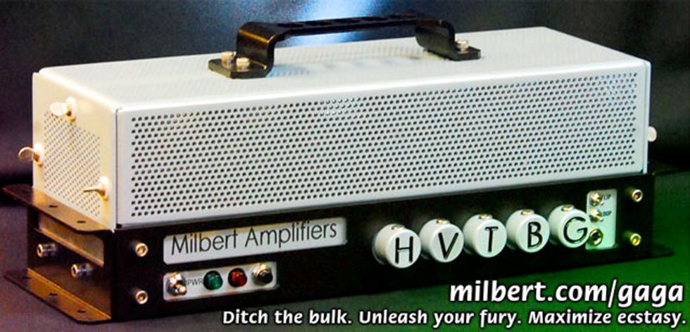 Germantown, MD (January 2, 2012) -- Milbert Amplifiers has announced they are now shipping production models of the GAGA-90 tube guitar amp. Milbert says that the GAGA, "offers serious advancements in guitar, bass and instrument amplification." The amp is 90 Watts at 12 pounds total weight and features a number of trademarked technologies including Use-Any-Tube Technology, Purest Possible Tube Performance, Blow-Proof Output, Auto-Everything, and Universal Power.