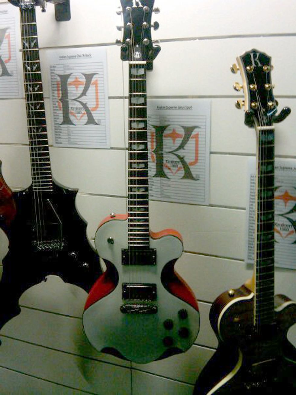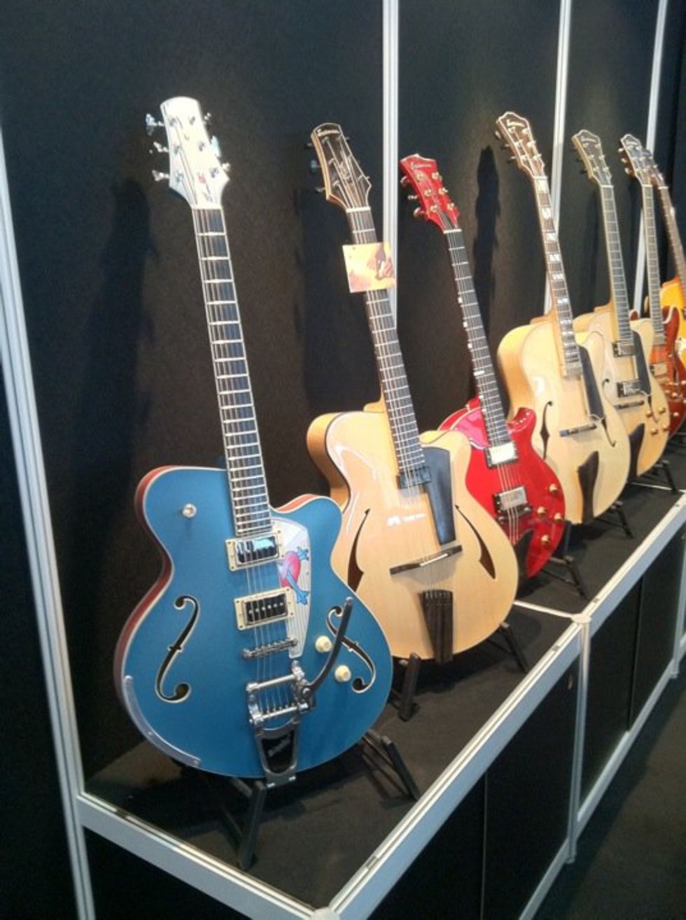 The irreverent design genius of Switzerland-based Claudio Pagelli was on display at the Eastman display. Pagelli designed the two archtops on the left.