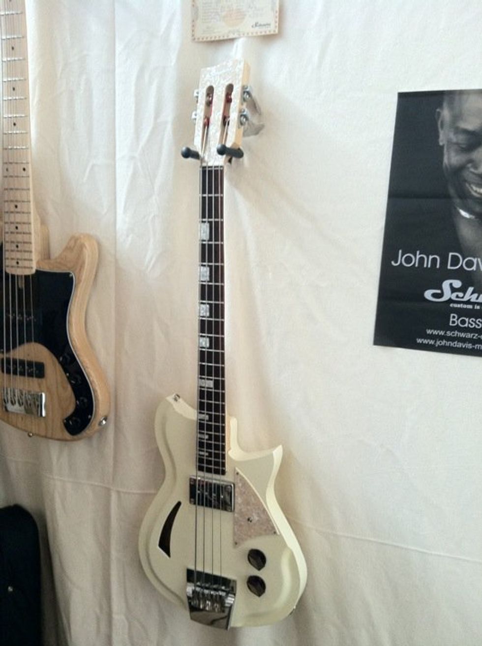 Schwarz Custom Guitars semi-hollow, 30 1/2-scale Arby bass with splittable humbucker, slotted headstock, and pearloid position markers. To the left is a John Davis Signature SYAM 5-string bass. schwarz-custom.de