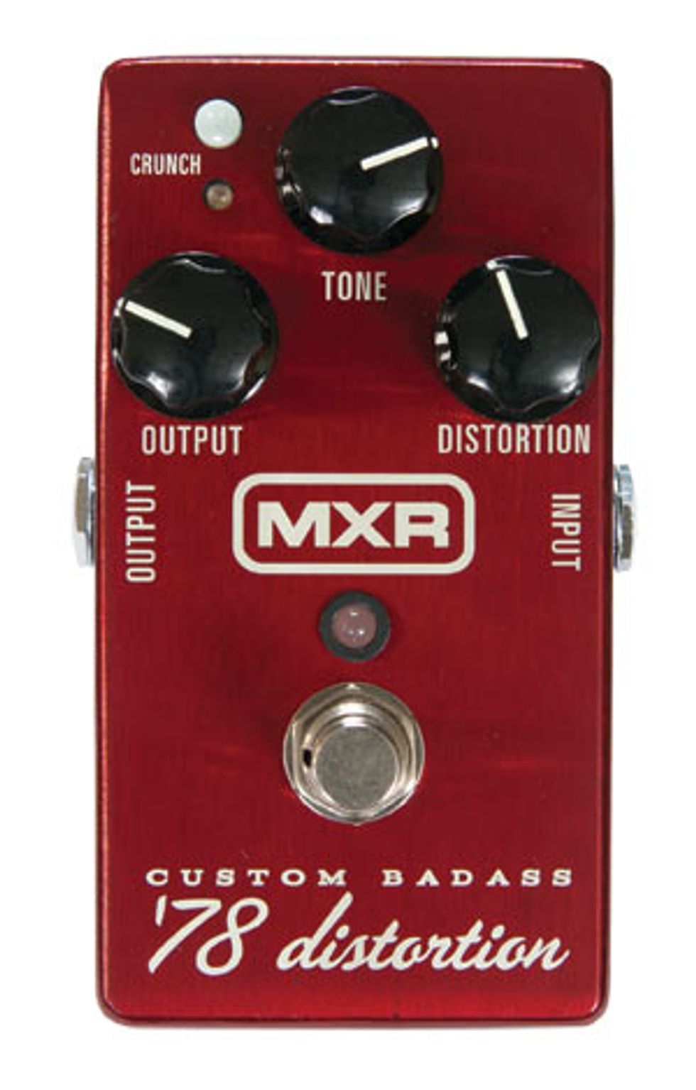Looking a little like a compact muscle car, the ’78 is housed in the classic MXR casing and finished in a deep metallic jewel red. The most obvious controls are fairly standard—Output, Tone and Distortion. But there’s also a Crunch button (lit with a blindingly bright blue LED) that’s one the keys to the Badass in this pedal’s name.
