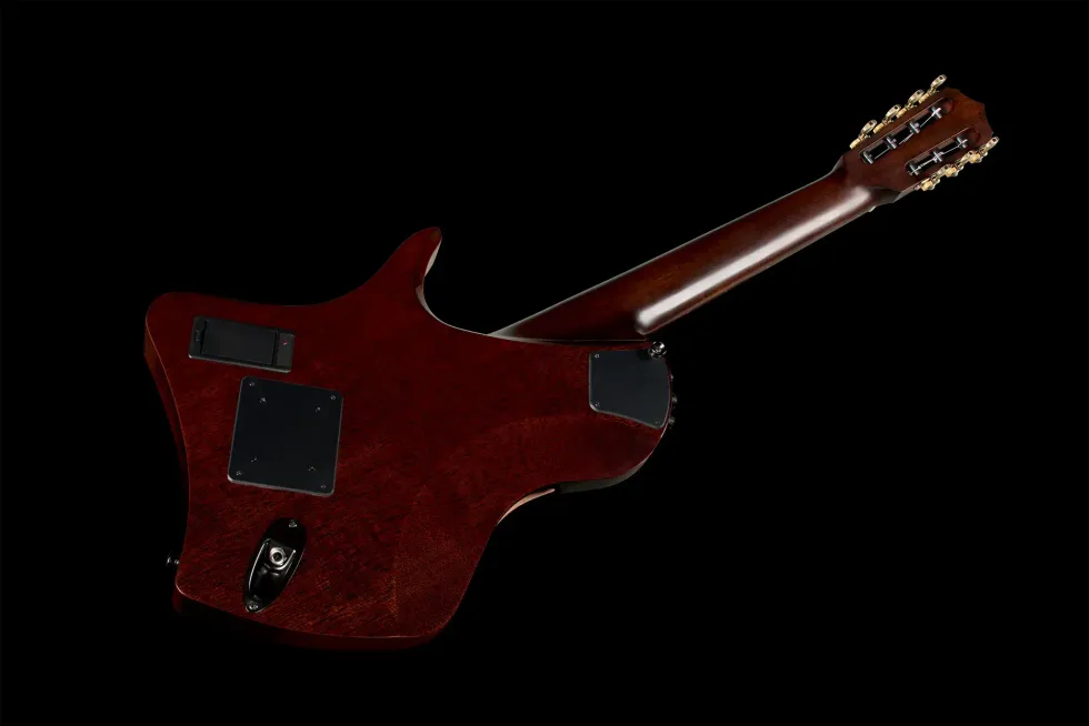 The Abasi Stage 7 features a thin, resonant, extensively chambered mahogany body with custom internal bracing that balances acoustic character with controlled stage performance. This construction minimizes feedback at higher volumes while preserving the organic response expected from nylon strings. Built on the ergonomic foundations of the Larada platform, its sculpted contours and streamlined body depth integrate naturally with the player’s body, whether seated or standing.