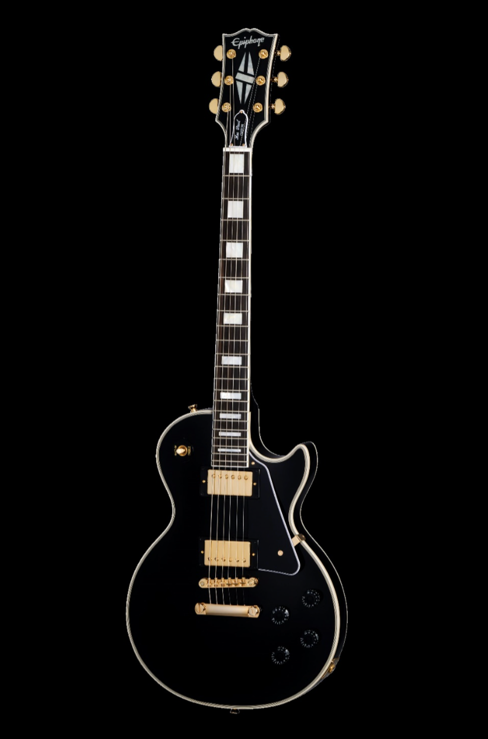 As part of the ongoing collaboration with Gibson Custom, Epiphone is proud to introduce the flagship Les Paul Custom to the Inspired by Gibson Custom lineup. Replete with all of the classy “tuxedo” appointments that the model is known for, this beautiful guitar has a one-piece mahogany Custom Shop LP Custom Profile neck with a 50s Rounded C profile, an ebony fretboard, and mother-of-pearl block fretboard inlays. There are also mother-of-pearl split diamond and Epiphone logo headstock inlays on the Gibson-style “open book” headstock. Gold hardware, including Grover® Rotomatic® 18:1 gear ratio tuners, gives it even more visual appeal. The solid mahogany body has a maple cap for a touch of added sonic bite, while the Gibson USA 490R and 498T pickups provide tonal sophistication and plenty of muscle to back up all the beauty. They’re hand-wired to CTS® potentiometers, a Switchcraft output jack and pickup selector switch, and Mallory™ capacitors. The Epiphone Les Paul Custom is available worldwide in Ebony and Alpine White finishes. An Inspired by Gibson Custom double diamond logo is on the back of the headstock, and a black hardshell case with the Inspired by GibsonCustom logo and a goldenrod interior is also included.