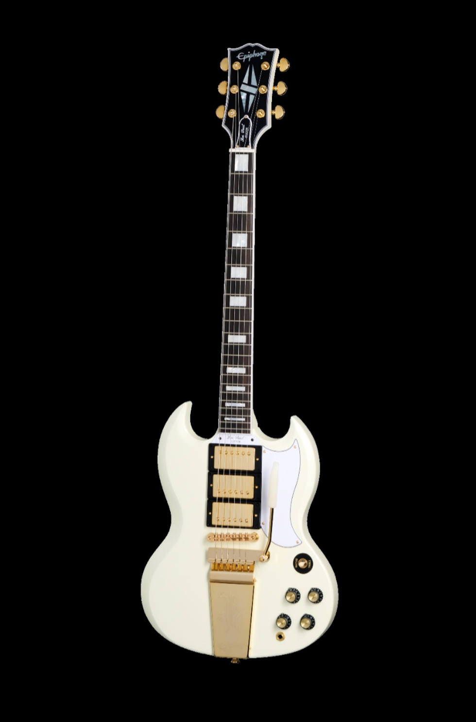Made in collaboration with Gibson Custom, the Epiphone 1963 Les Paul SG With MaestroVibrola is a stunning recreation of the classic vintage model. 1963 was the last year that the “LesPaul” moniker was used on the SG Custom and the first year for the Maestro™ Vibrola™. The premium appointments the model is known and loved for are all present here, including a one-piece mahogany Gibson Custom LP Custom Profile neck with a long neck tenon, a SlimTaperprofile, and a bound ebony fretboard. It also features mother-of-pearl block fretboard inlays and a Custom split diamond headstock inlay on the bound Gibson-style “open book” headstock. The electronics are equally impressive, with three USA Gibson Custombucker humbucking pickups hand-wired to CTS potentiometers, Mallory capacitors, and a Switchcraft pickup selector toggle switch and output jack. The VOS (Vintage Original Sheen) Classic White finish is nicely complimented by the gold hardware, including 18:1 ratio Grover Rotomatic tuners. A black hardshell case with Inspired by Gibson Custom graphics and a goldenrod interior is also included.