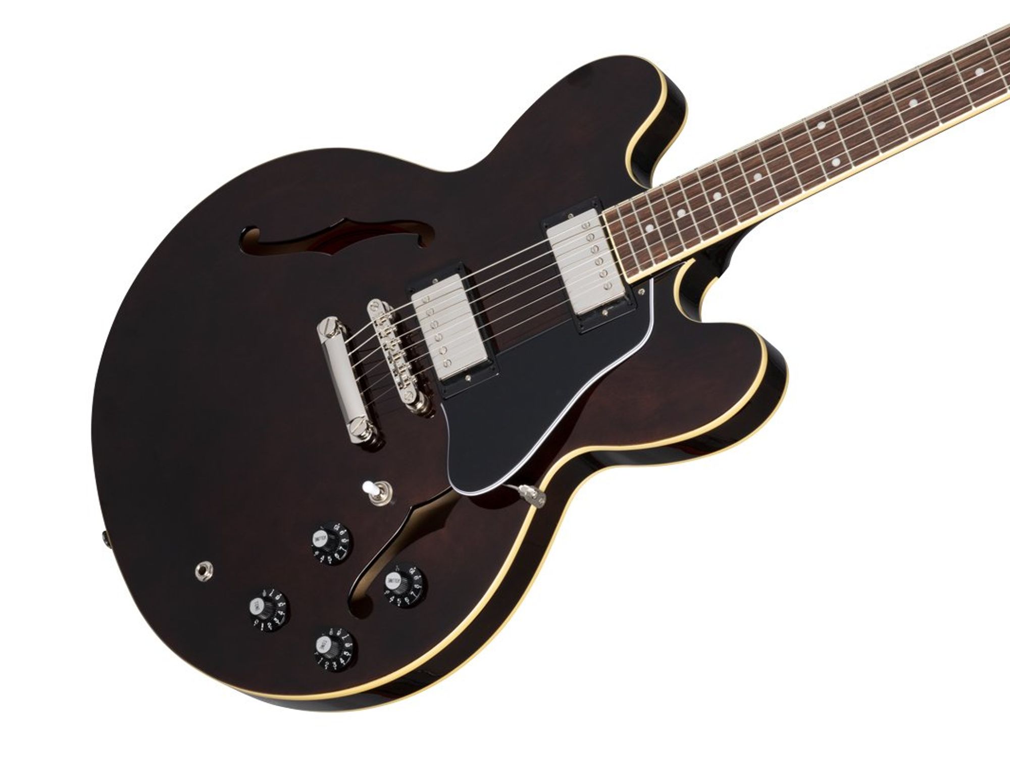 The Jim James Epiphone ES-335 features a Seventies Walnut-finish with a 5-ply laminated maple body, a Jim James Custom SlimTaper C profile, and an Indian laurel fretboard with dot inlays.