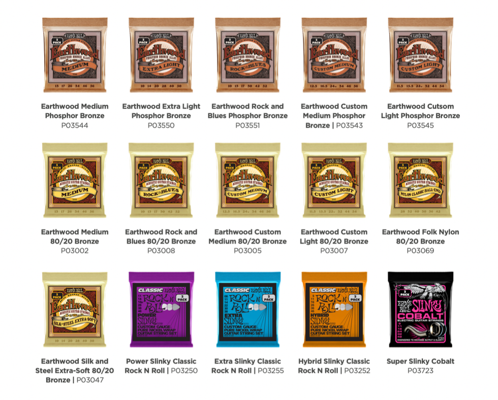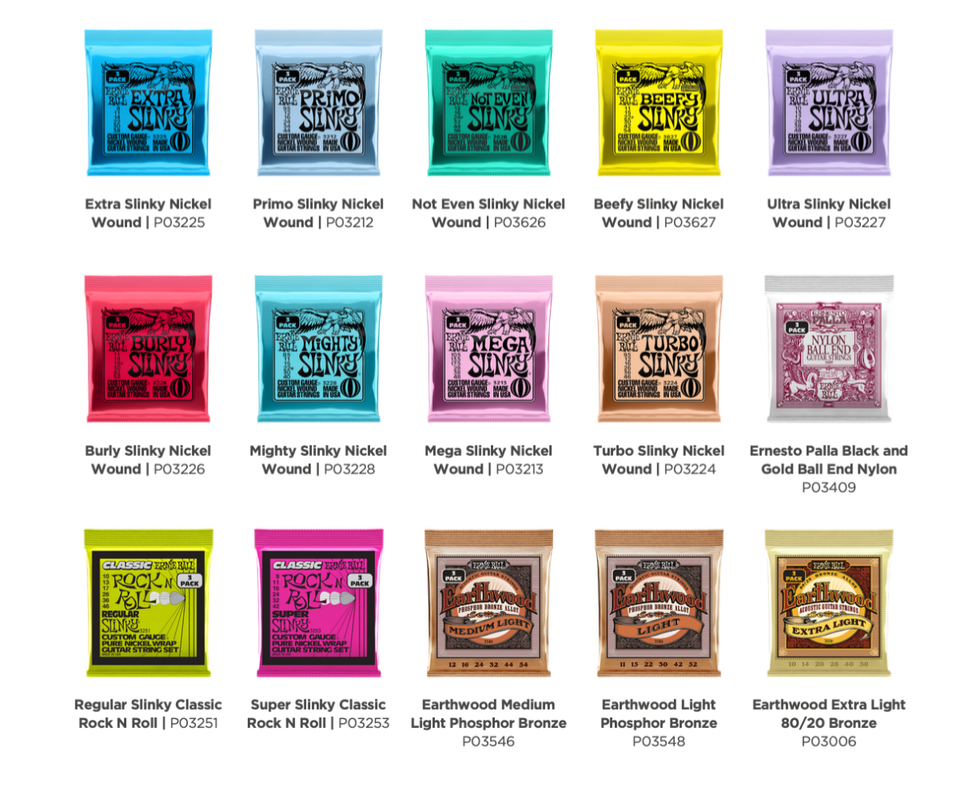 30 new 3-pack string offerings to Ernie Ball's Slinky, Classic Rock n Roll, Cobalt, Earthwood, and Ernesto Pallo string sets.