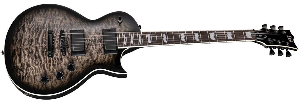 The LTD EC-400QM is available in See Thru Black Sunburst and Vintage Burst finishes. This single-cutaway guitar shape features set-thru construction at 24.75” scale, a quilted maple top, white binding on the body, neck, and headstock, and a rosewood fingerboard. Its components include a TOM-style bridge and tailpiece, and a set of EMG 81 (bridge) and EMG 85 (neck) active pickups.