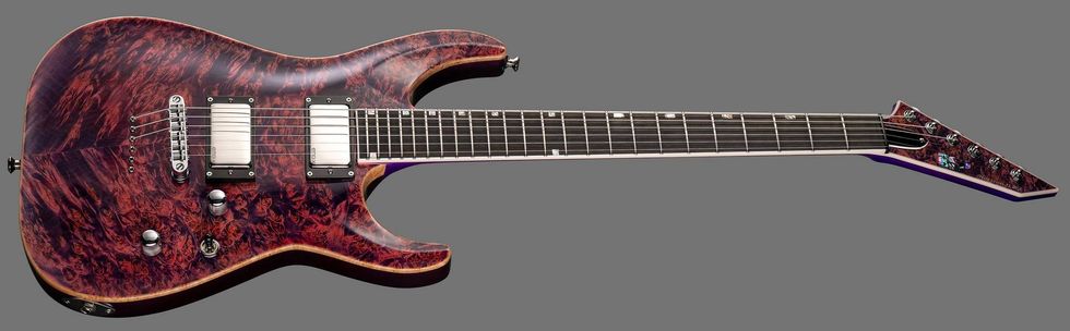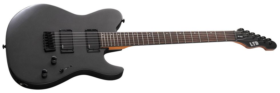 A new LTD shape is also available in the 400 Range. The LTD TH-400 (available in Charcoal Metallic and Scarlet Metallic) is built with bolt-on construction at 25.5” scale, with a mahogany body, roasted maple neck, and rosewood fingerboard. Components include an LTD fixed hardtail bridge with string-thru-body, LTD locking tuners, and a set of EMG 81 (bridge) and EMG 85 (neck) active pickups.