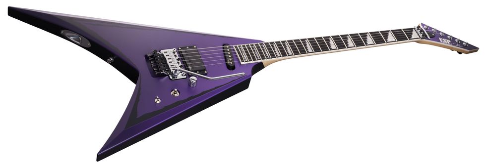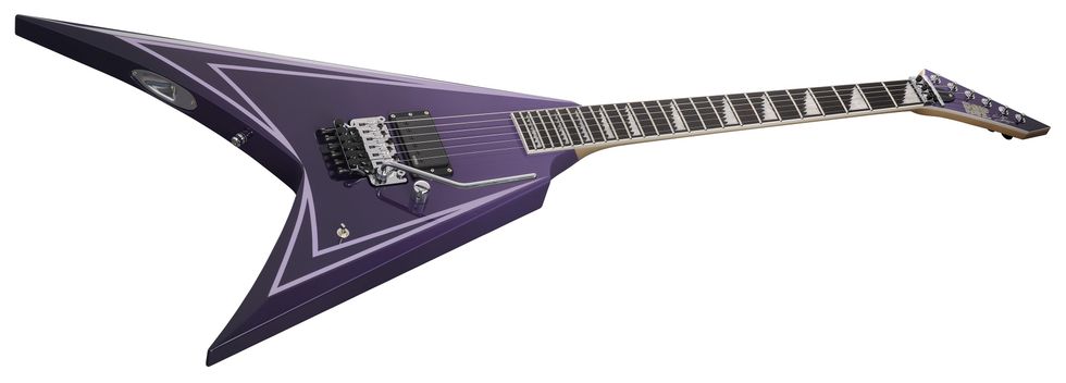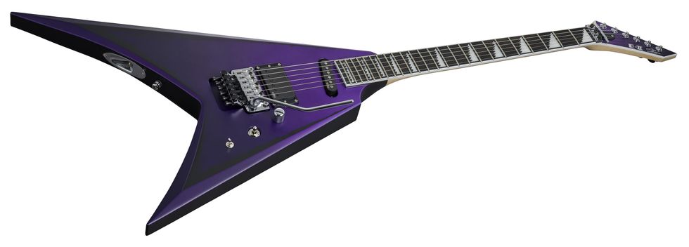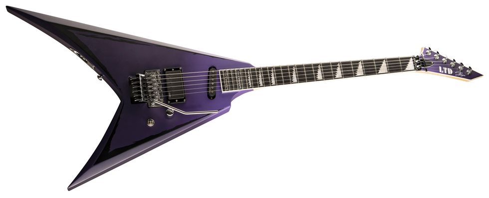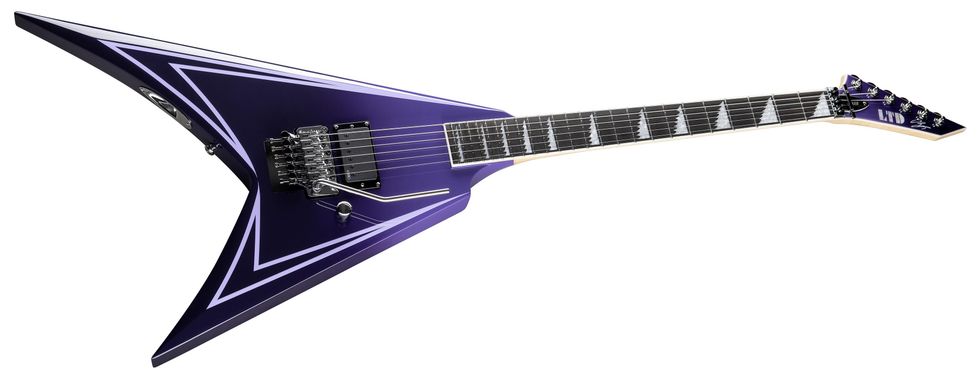 The Alexi Hexed - available in LTD and ESP versions - comes in Purple Fade finish with light purple pinstripes with matching back and sides. This guitar's sound is powered by a single EMG HZ F-H2 passive pickup with volume control. This ceramic high-gain pickup offers excellent presence and clarity with a punchy response. The LTD Alexi Hexed includes Grover tuners and a double-locking Floyd Rose 1000 bridge. The ESP Alexi Hexed, built by hand one at a time in the ESP Custom Shop in Tokyo, includes Gotoh locking tuners, ESP strap locks, and a double-locking Floyd Rose Original bridge, as well as an ESP MM-04 active boost switch with adjustable EQ settings and up to +18dB of boost. Both models include a deluxe ESP hardshell case.