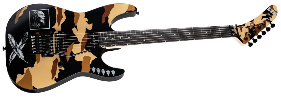 ESP debuted a new Signature guitar for the company’s longterm artist endorsee George Lynch (Dokken, Lynch Mob) with the LTD GL Desert Eagle, a re-imagining of his famous Kamikaze model. It features an alder body and maple neck, joined with bolt-on construction at 25.5” scale. Its neck profile implements George’s original U shape, and it includes a Macassar ebony fingerboard and 22 extra-jumbo stainless steel frets. Components on the LTD GL Desert Eagle include a Floyd Rose 1000 SE double-locking tremolo with stainless steel screws, a special low-friction volume pot, and a special pickup combination that includes a Seymour Duncan Distortion pickup in the bridge, with push-pull coil splitting on the single volume knob, and an ESP SS-120 single-coil in the neck position. A portion of the proceeds of every LTD Desert Eagle will be contributed to George’s non-profit charity that assists Native American communities and causes. This guitar includes a deluxe ESP hardshell case.