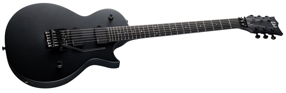 The LTD MK EC-FR is a new addition to the Signature Series for Mille Petrozza, founder of pioneering and influential thrash band Kreator. The MK-EC FR starts with the familiar single-cutaway shape of the ESP Eclipse, but offers a flat-top alder body with no bevels, horn scoop, or arm cut, and features black binding on the body, neck, and headstock. Other features include neck-thru-body construction at 25.5” scale, a three-piece thin u-shaped maple neck, and Macassar ebony fingerboard with mother-of-pearl dot inlays, Luminlay glow-in-the-dark side markers, and 24 extra-jumbo stainless steel frets. The all-black hardware on the MK-EC FR includes a Floyd Rose 1000 SE double-locking tremolo with stainless steel screws, precise Grover tuners, and a set of direct-mount EMG 81X (bridge) and EMG 85X (neck) active pickups with brushed black chrome covers. It includes a deluxe ESP hardshell case.