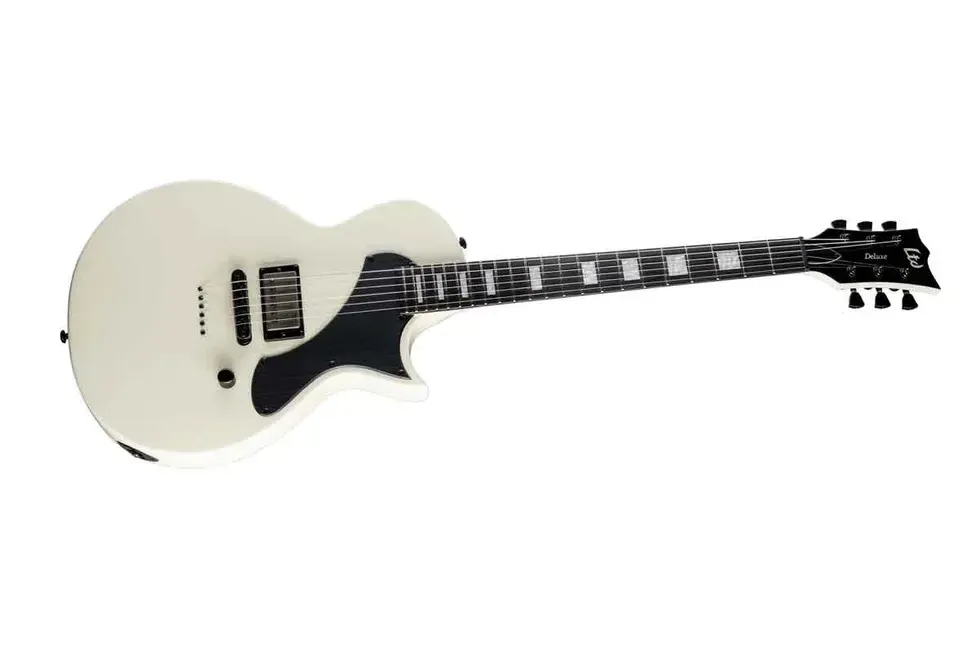 The LTD Deluxe EC-01FT is a single-cutaway guitar with a flat-top body and clean electronics layout. It features a comfortable 24.75” scale with a smooth set-thru heel construction. It features a mahogany body and a distinctive brushed black pickguard. Its mahogany neck has a 43mm nut, slightly wider than is standard for EC models, allowing for comfortable ergonomics in power chords and fluid lead lines. It features a Macassar ebony fingerboard with pearloid block inlays and 22 extra-jumbo stainless steel frets. A recessed TonePros TOM bridge with string thru body keeps string height low and comfortable while maximizing resonance. Other components include LTD locking tuners.