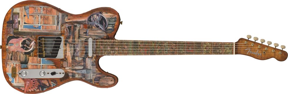 Greg Fessler found inspiration in Fellow Master Builder Dale Wilson, who travels the Southwest, including many Ghost Towns. Artist Dave Newman, who Fessler has worked with for years, is a Southwest native. Dave's work is stimulated by what he sees around the Southwest, creating an organic segway to the partnership. Innovative specs include Josefina Campos Hand-Wound pickups along with Merle Haggard electronics. Beneath Newman’s artwork lies pre-distressed ash, lending the guitar an authentic finish. This model is ideal for guitar enthusiasts or collectors with respect and affinity for Southwestern art. $17,500.00 USD.