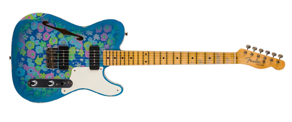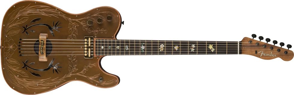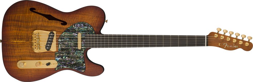 This Telecaster is inspired by a gorgeous abalone shell pickguard that Kyle McMillin has cherished for years. A deeper review of the shell presented McMillin the perfect combination of specs this guitar needed: a custom abalone veneered pickguard, complemented with abalone side dots and abalone Fender logo in the headstock, a satin tobacco burst finish and Tasmanian blackwood Thinline body with black top binding. The Prestige Thinline Telecaster is equipped with Josefina Campos Hand-Wound original blackguard (bridge) and twisted Tele (neck) pickups, possessing a traditional Fender sound with a unique and elegant look. $11,000.00 USD.