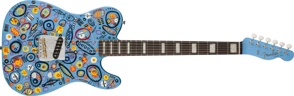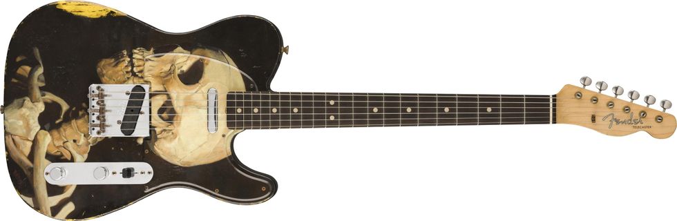 Paul Waller partnered with artist David Kassan, an oil/canvas painter, to create hand-painted art inspired by a skeleton of the Saint John the Divine Cathedral in New York City. The Prestige Saint John’s Skeleton Telecaster is painted on top of a relic finish with black over graffiti yellow, a different finish than Fender’s typical gloss finish on art guitars. While the artwork appears to be a picture at first glance, it becomes individual brushstrokes of oil colors. David Hassan notes of this artwork, “this has the profound potential to wake us up and breathe more life into our lives. A painting surface holds all of the thoughts of the artist that paints on it. In this case, the Telecaster is the ossuary for all of my decisions to create this work. It embodies/absorbed all of my success as well as my failures in painting it. $21,500.00 USD.