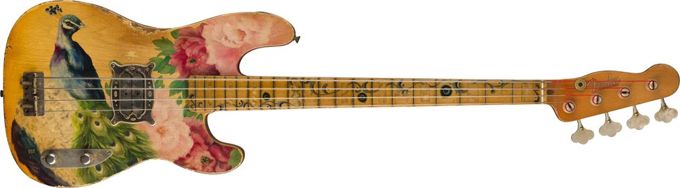 After creating the Flamingo Telecaster last year with Ian Ward, a prolific parrot breeder and aviary enthusiast, Vincent Van Trigt sought out the opportunity to work with Ward again, inspired by his illustrations of birds. Vincent Van Trigt notes, “historically peacocks are a symbol of transformation, restoration and rejuvenation, which is what music is. It’s transformative, it takes people on a journey and rejuvenates their souls.” The 1952 Peacock Precision Bass is adorned with Ward's artwork and inlays that match beautifully as well as Josefina Campos Hand-Wound special design pickups with custom mounting rings. The pickup ring with 2 ‘51 pickups is wired in series while the reversed headstock is a nod to Dusty Hill. The 1952 Peacock Precision Bass is perfect for a bass player looking for a classic Fender instrument with some modern twists and gorgeous artwork. $22,500.00 USD.