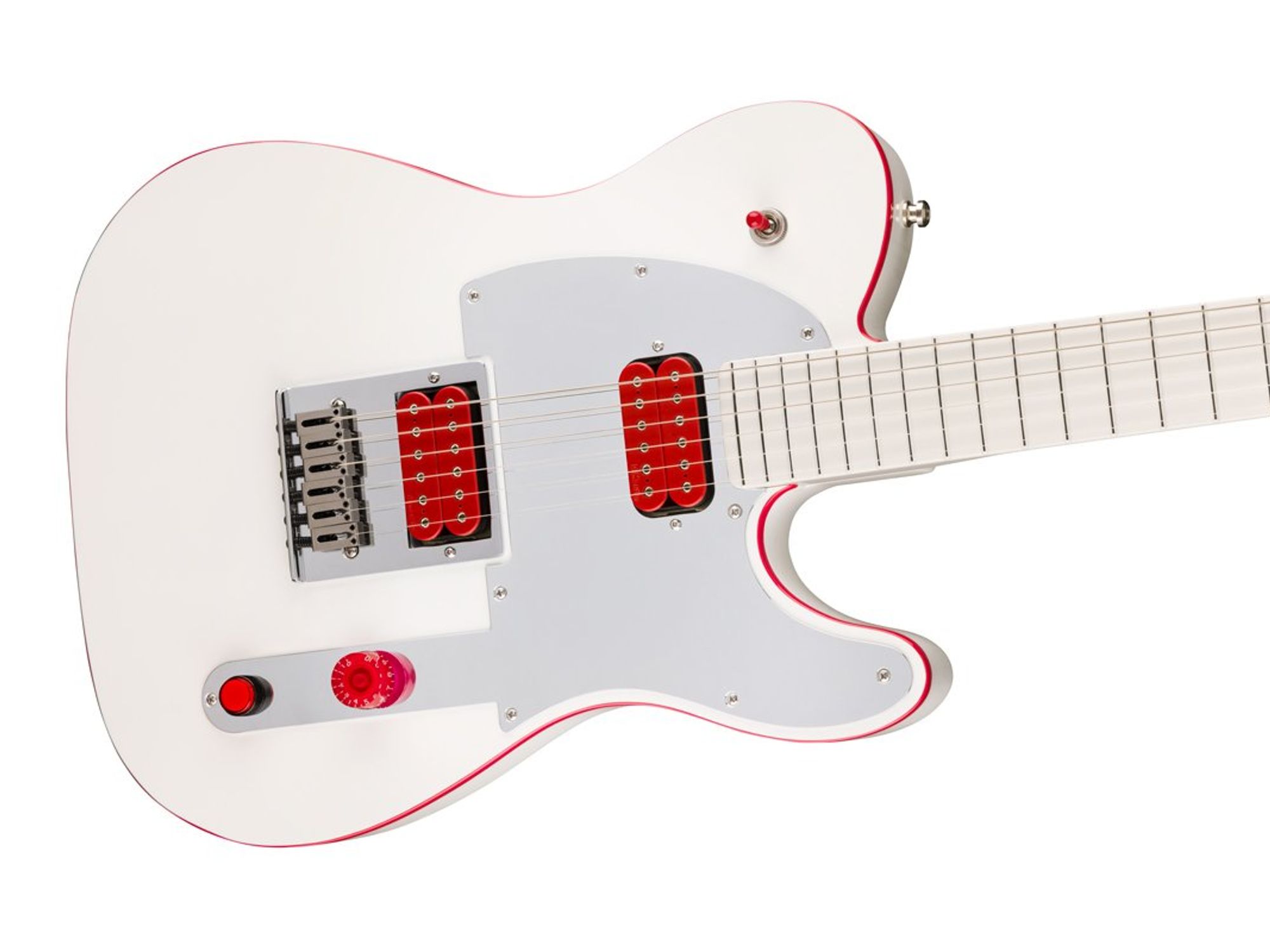 Introducing the John 5 Ghost Telecaster. It features a top-bound alder body and 1-piece maple neck finished in an enchanting Arctic White gloss and accented by striking red appointments and a gleaming mirrored pickguard/control plate.