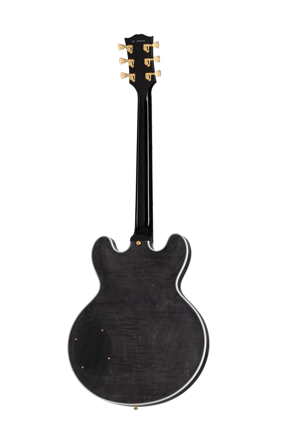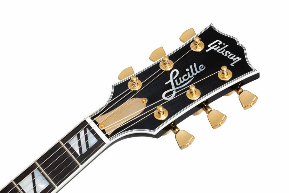 The Gibson B.B. King Lucille Legacy features standout appointments including split block inlays, gold hardware, with a gold “B.B. King” engraved truss rod cover, and a TP-6 tailpiece with fine tuners. A “Lucille” mother of pearl inlay adorns the headstock, and the ebony fretboard features split block mother of pearl inlays. A mono Varitone switch, along with four audio taper CTS potentiometers and paper-in-oil Bumblebee capacitors, are paired to Gibson Custombucker humbucking pickups. The hollow-body design remains, but the f-Holes are gone, in keeping with B.B. King’s personal preferences. The top, back and sides of the body of the guitar feature figured maple veneer, which is visible through the Transparent Ebony finish.