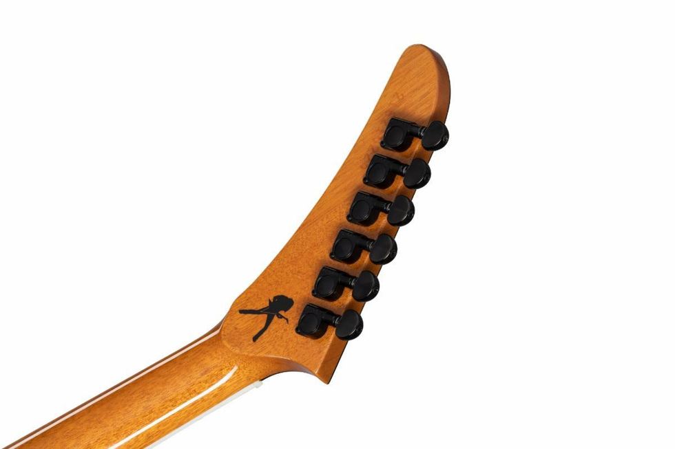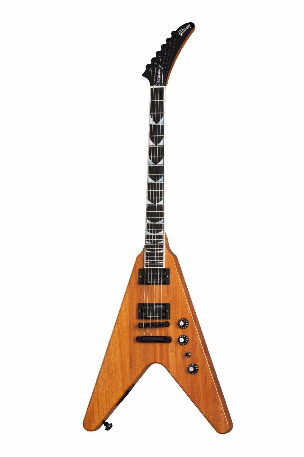 These guitars deliver powerful, heavy sounds and exceptional playing performance on the stage and in the studio that Dave demands. The 25.5” scale mahogany neck has an ebony fretboard with a compound fretboard radius, 24 medium jumbo frets, mother of pearl “teeth” inlays, an Explorer-style headstock with Grover Mini Rotomatic tuners with Kidney buttons, and a Graph Tech nut. The mahogany Flying V-style body is equipped with a Tune-O-Matic bridge, a Stop Bar tailpiece, and a pair of Dave Mustaine’s signature Seymour Duncan Thrash Factor pickups. The Flying V’s are available in both an Antique Natural and a Silver Metallic nitrocellulose lacquer finish which are complemented by black chrome hardware. A hardshell case is also included.