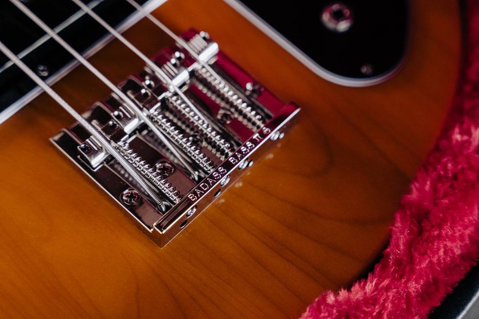 The headstock features the classic Grabber “V™” shape, paired with open-gear bass tuners and historic clover buttons. A bone nut enhances resonance, while the Leo Quan® Badass II™ bridge delivers powerful attack, sustain, and full adjustability. Strings run through the body and are anchored with ferrules on the back, contributing to the bass’s rich tone and lasting sustain.
