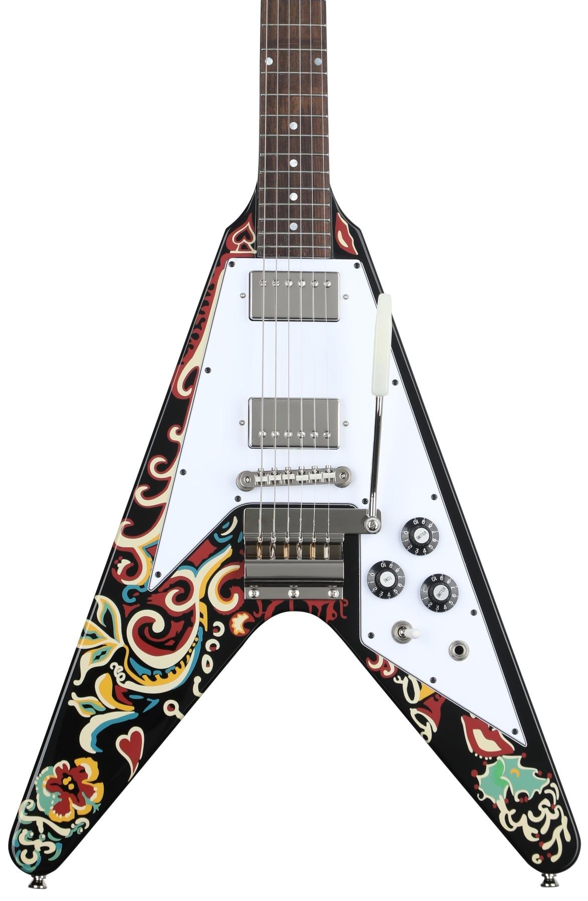 Originally a Sunburst, Jimi Hendrix customized his Ebony-refinished Gibson Flying V with striking psychedelic graphics that he hand-painted on the original guitar, which are carefully recreated here on the Flying V. As a fitting tribute to one of the world’s most legendary and famous lefty guitar players, the Epiphone Jimi Hendrix “Love Drops” Flying V is available in right and left-handed versions. The Jimi Hendrix “Love Drops” Flying V also features a mahogany body, a one-piece mahogany neck with a Rounded C profile, a laurel fretboard, and 22 medium jumbo frets.