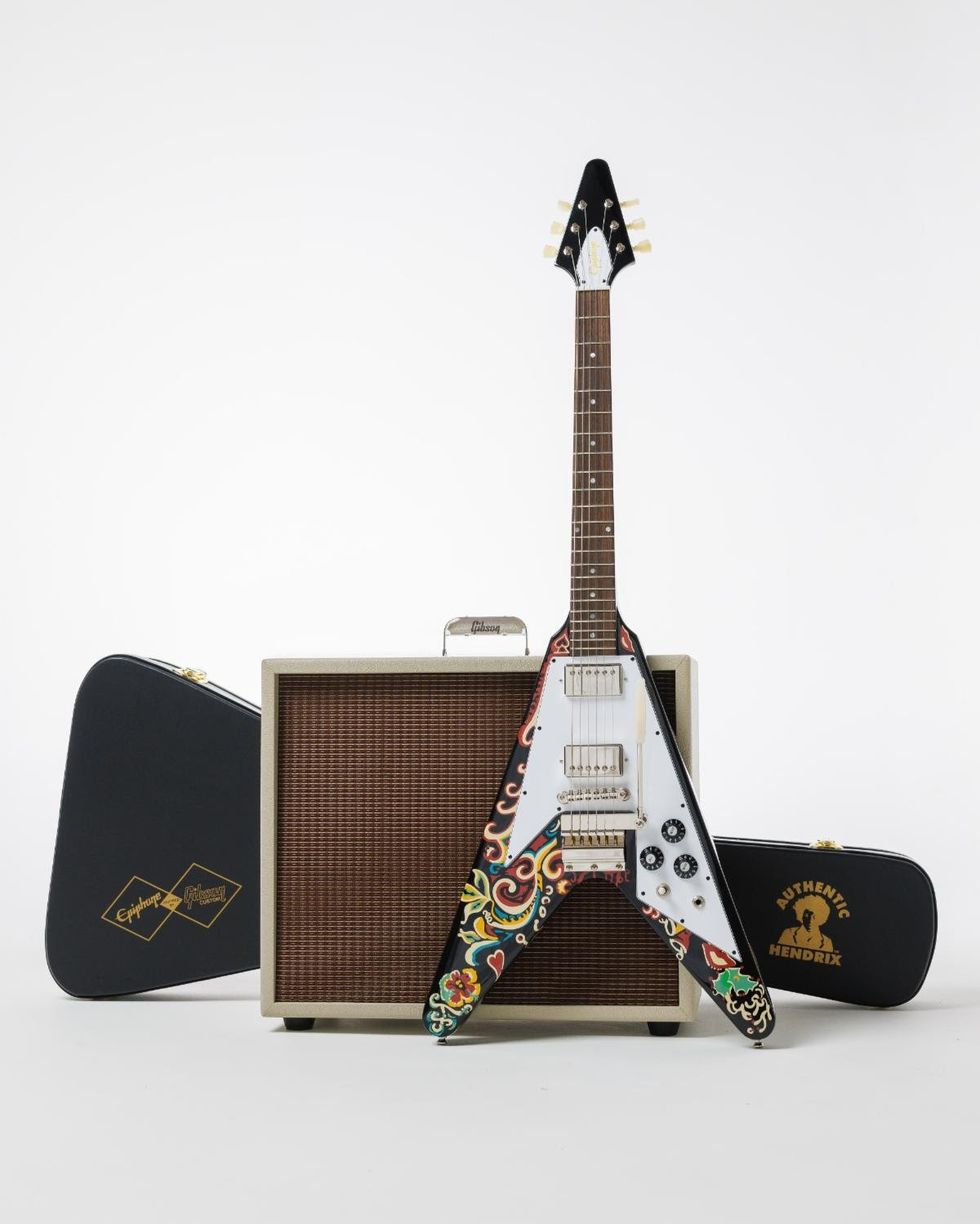 The Epiphone Jimi Hendrix “Love Drops” Flying V with custom hardshell guitar case.