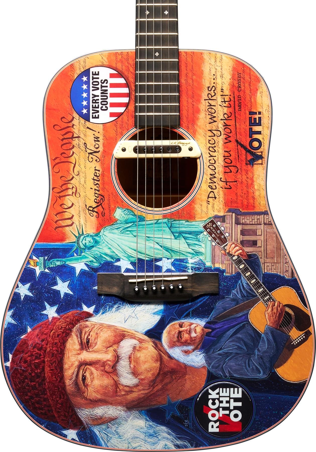 The Martin D-11E Rock the Vote acoustic-electric guitar is a special edition instrument crafted to inspire people to participate in our democracy. This collaboration between Martin Guitar, David Crosby’s estate, Rock the Vote, and artist Robert Goetzl tells a powerful story. “David was a patriot,” says Executive Chairman Chris Martin IV. “He believed deeply in this great experiment of ours, and his passion for voting is something we wanted to honor and continue.”