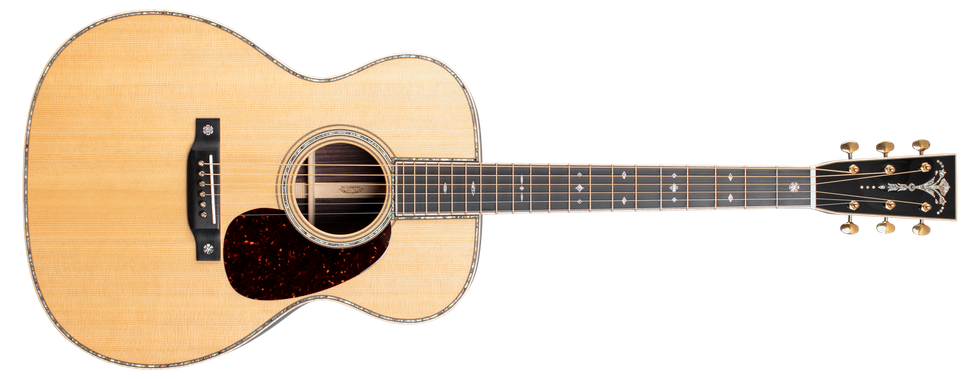 The 000-42 Modern Deluxe is packed with custom features and modern technology. The vintage appointments include a Sitka spruce VINTAGE TONE SYSTEM (VTS) top, a dovetail neck joint, and natural protein glue construction, giving it the rich, fully-aged Martin tone that has inspired generations. These guitars feature European flamed maple binding (on the body, fingerboard, and headplate), stylish gold frets, gold open-gear tuners, and an ornate torch logo inlaid in pearl on the headstock. Some ultra-modern features include Liquidmetal bridge pins with abalone dots and a composite carbon fiber bridgeplate that boosts volume, and a new neck shape that is slightly asymmetrical for maximum hand comfort up and down the fretboard. List price $7,199.