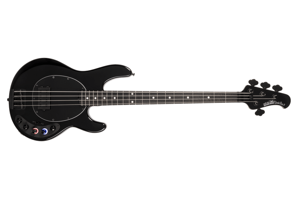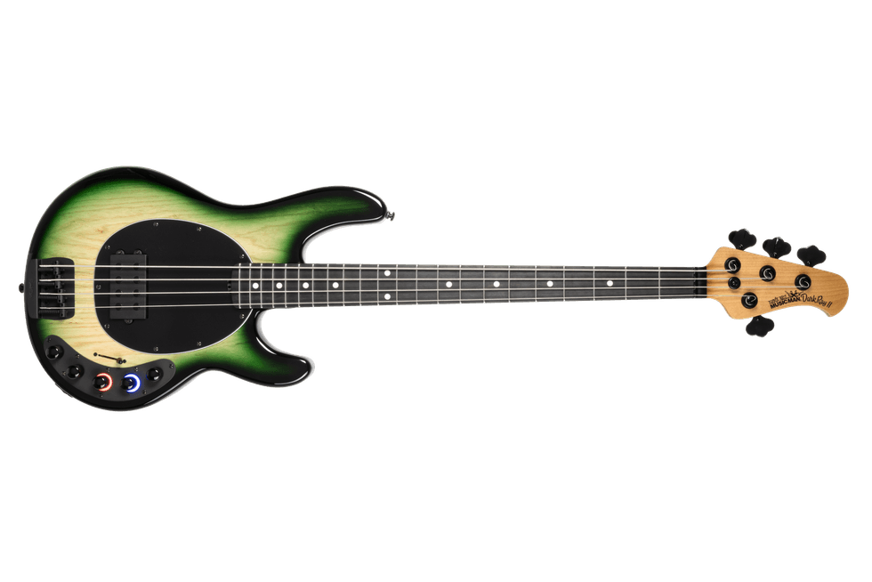 engaged and change color to indicate the selected mode, providing instant visual feedback. A three-way switch selects the core tone, octave only (middle position), or octave combined with distortion (neck position), making it easy to move from tight, punchy bass tones to massive, harmonically rich textures. Available in Black, Showtime, Spectralite, and Mean Green Burst, the DarkRay II delivers uncompromising tone, cutting-edge functionality, and unmistakable Ernie Ball Music Man style.